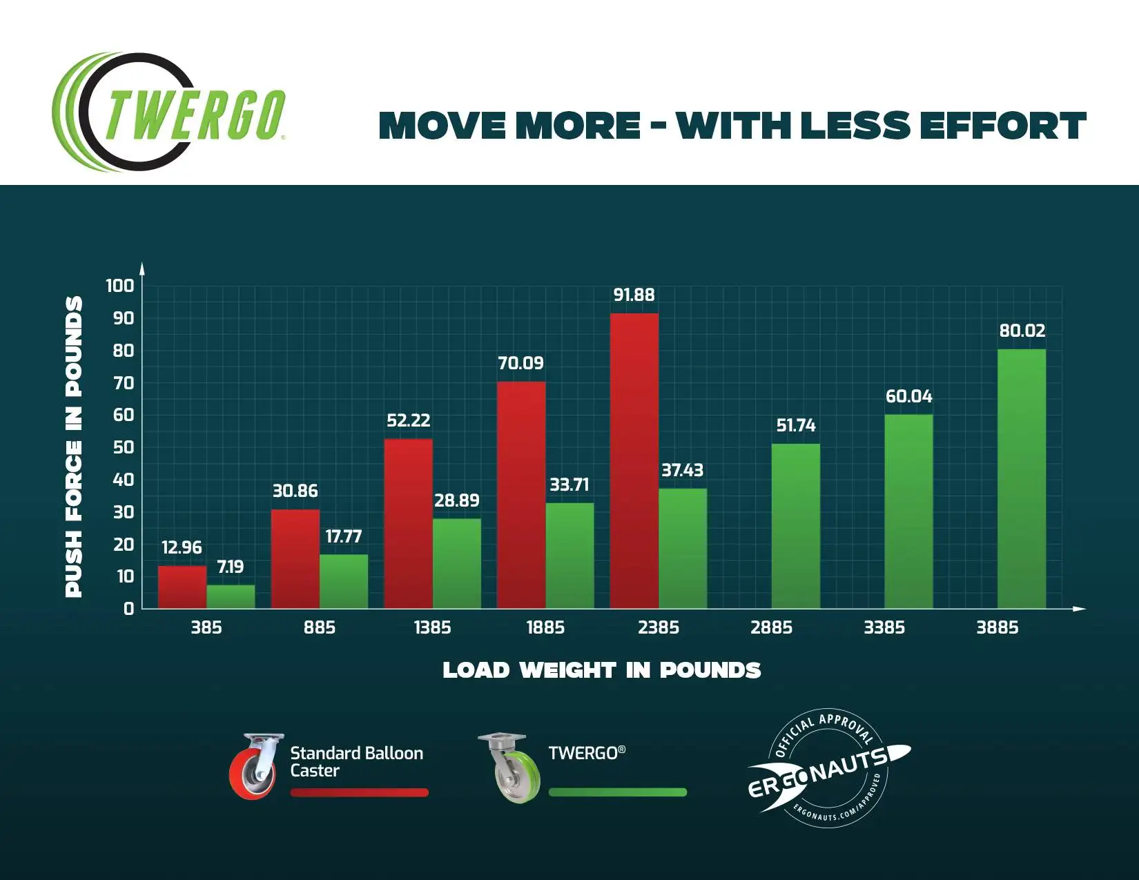 TWERGO’s patented design lowers push force, improving your operation’s efficiency. With this innovative ergonomic caster, workers